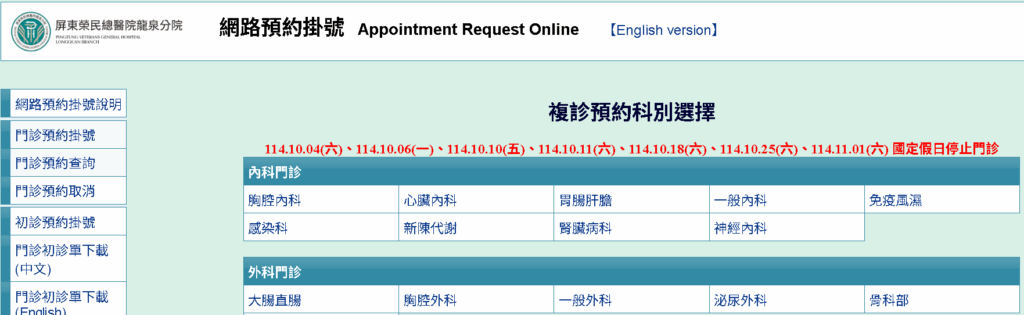 - 左側選單可以選預約、查詢、取消掛號、醫師請假查詢等資訊