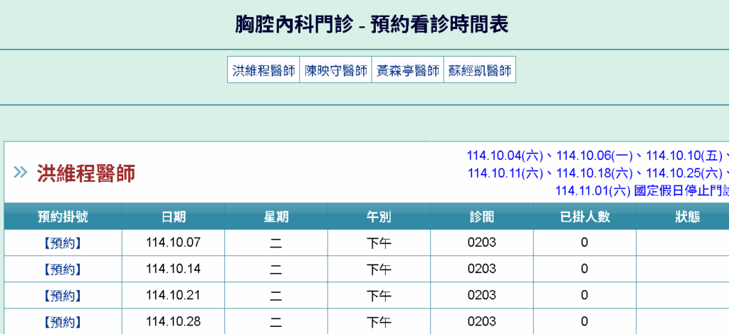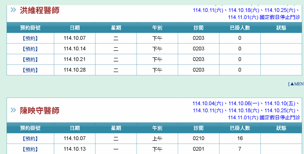 - 點入可看到該科所有醫師的預約情形(往下滑)